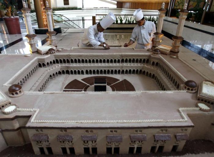 مجسمًا على شكل المسجد الحرام من الشيكولاته الصافية يبلغ وزنه 150 كج، وحجمه 2.5 متر في 5 أمتار.