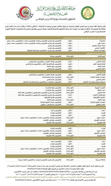 كما يتأهل الملتحقون بالوظائف المعلن عنها للعمل بكليات الجامعة في الرياض وجدة والأحساء والعمل في المستشفيات التابعة للشؤون الصحية بوزارة الحرس الوطني.