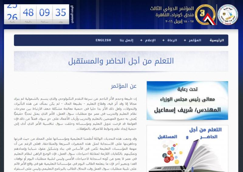 برعاية رئيس مجلس الوزراء، تعقد الهيئة القومية لضمان جودة التعليم والاعتماد مؤتمرها الدولي الثالث بعنوان "التعلم من أجل الحاضر والمستقبل" وذلك يومي 17 و 18 إبريل 2016، بفندق كونراد - القاهرة.