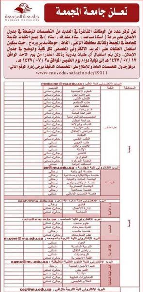 تعلن جامعة المجمعة عن توفر عدد من الوظائف الشاغرة في العديد من التخصصات الأكاديمية في جميع الكليات التابعة للجامعة ويتم تلقي الطلبات بدءاً من اليوم الموافق 24/4/2016 وحتى الخميس المقبل كما في الإعلان التالي
