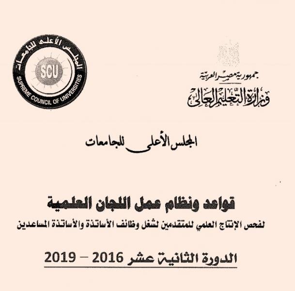 أقر المجلس الأعلى للجامعات بجلسته رقم 646 بتاريخ 4 إبريل 2016 (الدورة الثانية عشر 2016 - 2019) القواعد والنظم الخاصة بعمل اللجان العلمية لفحص الإنتاج العلمي للمتقدمين لشغل وظائف الأساتذة والأستاذة المساعدين في الجامعات المصرية