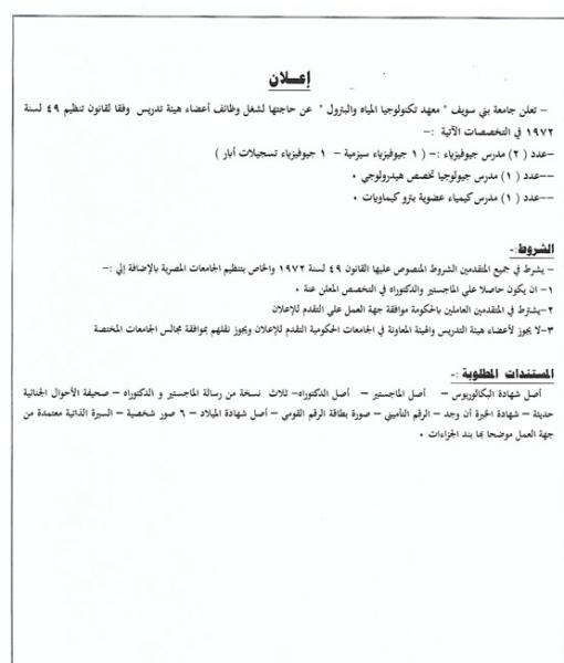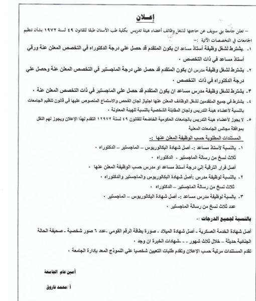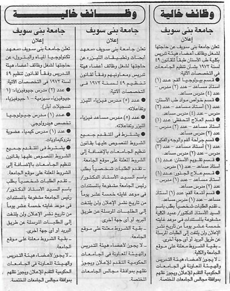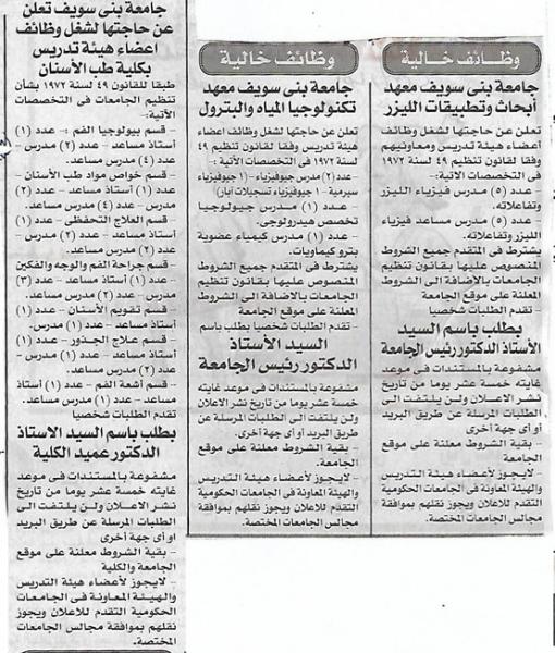 تعلن جامعة بني سويف عن حاجتها لشغل وظائف أعضاء هيئة تدريس بكلياتها للعام الجامعي 2016/2017 بمختلف التخصصات وذلك بكلية طب الأسنان ومعهد أبحاث وتطبيقات الليزر ومعهد تكنولوجيا المياه والبترول وفيما يلي الشروط والمستندات المطلوبة لهذه الوظائف على أن يكون التقدم خلال أسبوعين من تاريخ نشر الإعلان في 14 مايو 2016