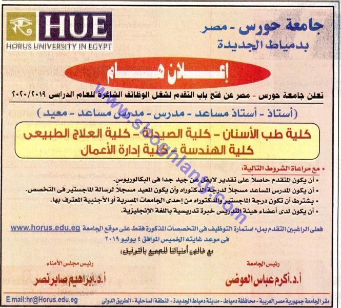 أعلنت جامعة حورس - مصر، بدمياط الجديدة بالصحف الرسمية عن العديد من الوظائف الأكاديمية الشاغرة (أستاذ/ أستاذ مساعد/ مدرس/ مدرس مساعد/ معيد) بكليات الجامعة، والتقديم من خلال الموقع الإلكتروني للجامعة في موعد غايته 4 يوليو 2019.