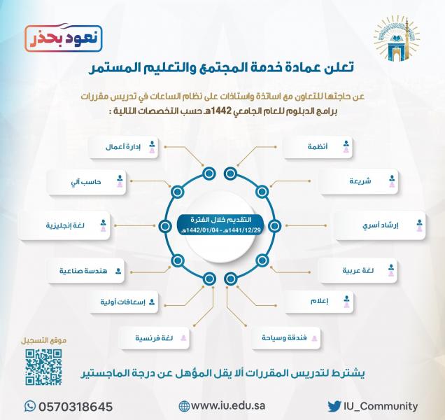 أعلنت عمادة خدمة المجتمع والتعليم المستمر بالجامعة الإسلامية بالمدينة المنورة بالمملكة العربية السعودية، عن حاجتها للتعاون مع أساتذة وأستاذات بنظام الساعات حسب التخصصات الموضّحة أدناه، حيث يبدأ التقديم خلال الفترة من 29/12/1441هـ وحتى 4/1/1442 هـ.