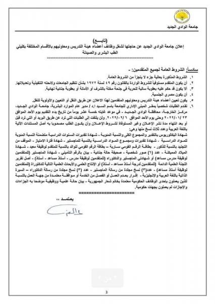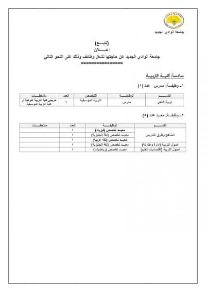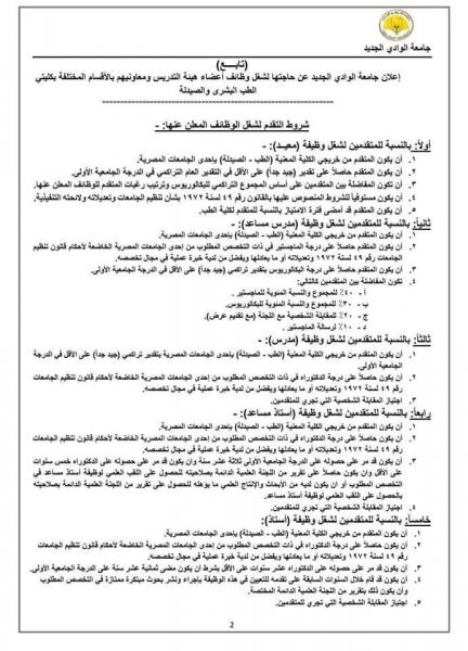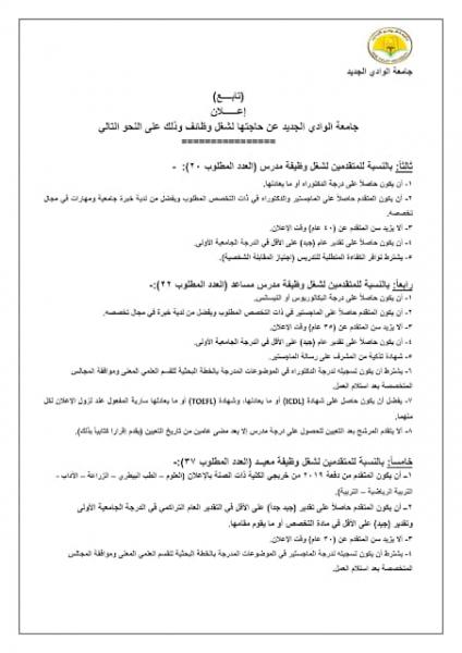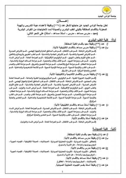 أعلنت جامعة الوادي الجديد عن حاجتها للعديد من التخصصات الأكاديمية من وظائف اعضاء هيئة التدريس ومعاونيهم - كادر خاص طبقا لقانون تنظيم الجامعات رقم 49 لسنة 1972 وذلك طبقا للأعداد والاقسام بالكليات كما يلي