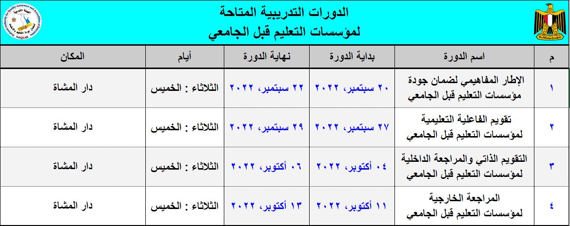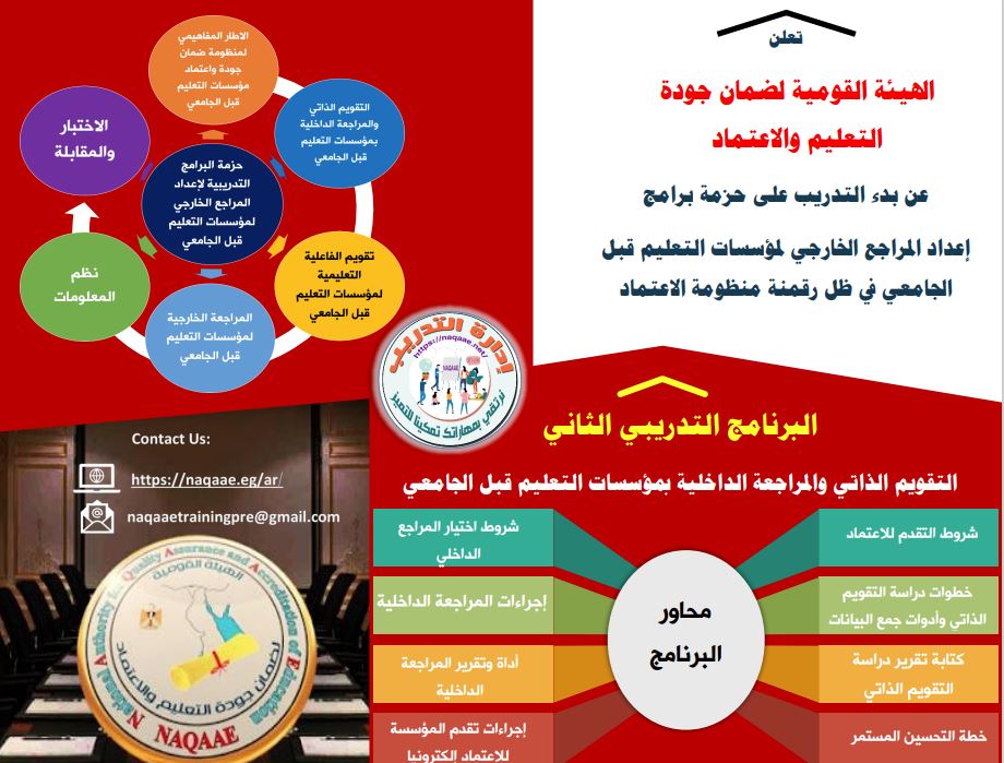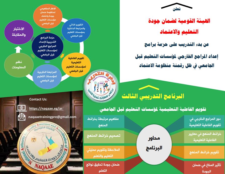 أعلنت الهيئة القومية لضمان جودة التعليم والاعتماد عن مجموعة من البرامج التدريبية لاعداد المراجع الخارجي خلال شهر سبتمبر 2022، والتسجيل من خلال النموذج نهاية الخبر، وفيما يلي تفاصيل الدورات ومواعيد عقدها: